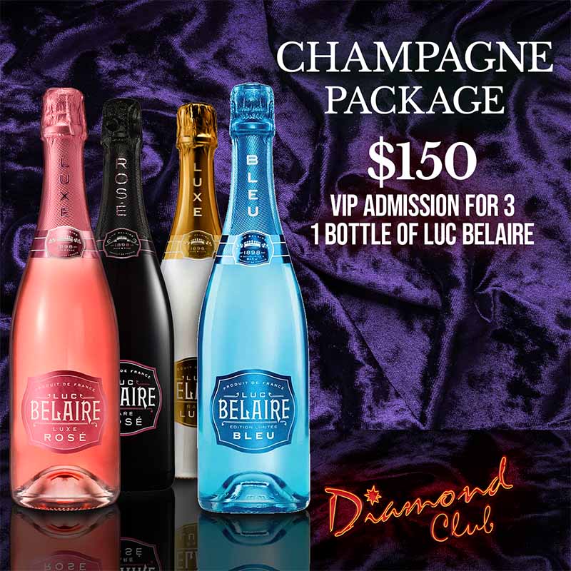 Celebrate in classic fashion with our Champagne Package, designed for more intimate groups looking for a bubbly night out. Choose your favorite bottle of Luc Belaire champagne and enjoy VIP admission for up to 3 guests. A simple, sparkling option that never goes out of style.